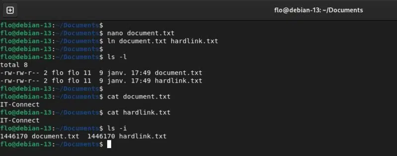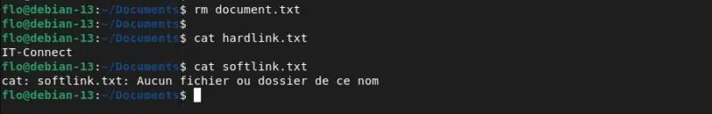Si vous supprimez le fichier , le fichier reste valide, car il faut supprimer toutes les références pour supprimer les données (c’est une différence avec le mécanisme de liens symboliques). Sachez qu’il est impossible de créer un lien physique vers un répertoire ou entre deux partitions/disques différents. Les liens physiques sont donc réservés aux fichiers.