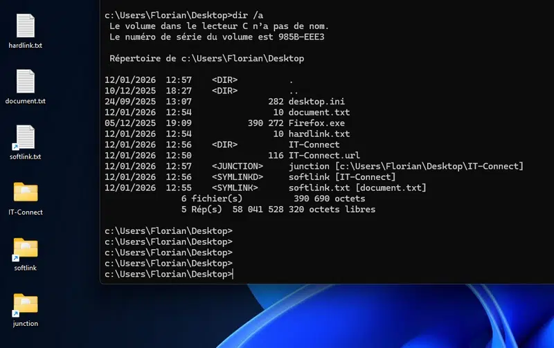 Même si Windows utilise souvent des Jonctions () pour ces dossiers système (elles existaient avant les liens symboliques modernes), les liens symboliques () existent aussi et peuvent être créés avec la commande . D’une manière générale, sur Windows, tous les types de liens peuvent être créés via cette commande.