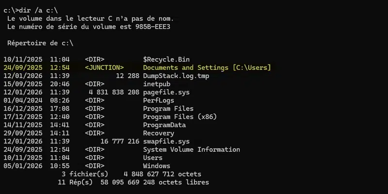 Sur Windows, il existe un troisième type de liens en plus des liens physiques et symboliques : les jonctions ou junction en anglais. L’exemple historique, qui nous ramène à l’époque de Windows XP, est le dossier suivant : . Par défaut, sur Windows 11, il existe une jonction entre le répertoire et .