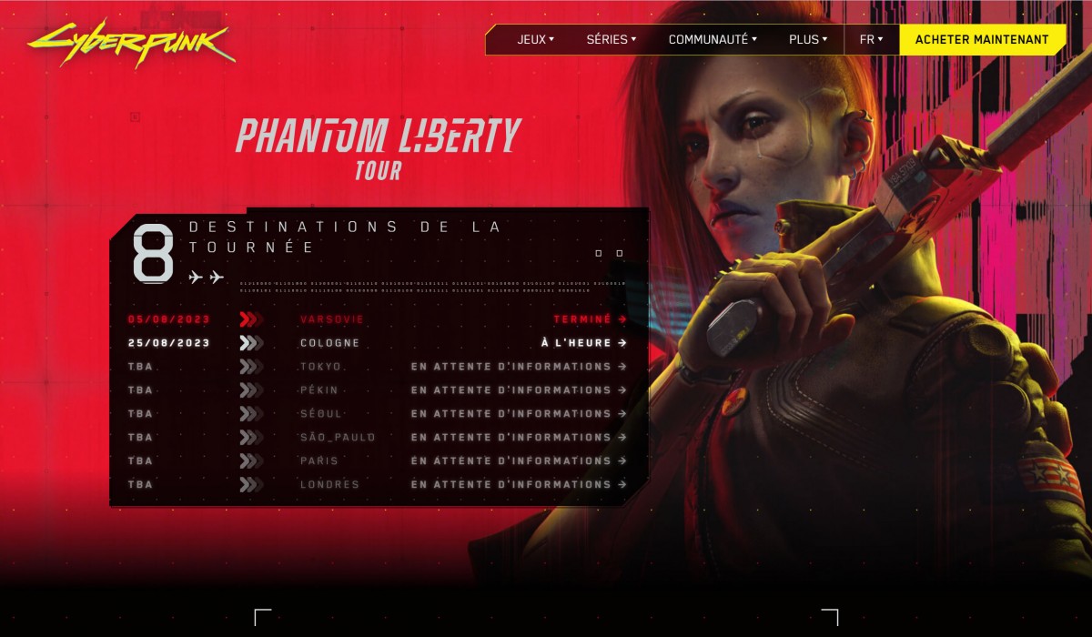 Encore un peu plus de deux mois avant la sortie de l’extension Phantom Liberty pour Cyberpunk, et l’évènement nomade Phantom Liberty Tour se met donc doucement en place. Après Varsovie, c’est au tour de Cologne de devenir ville hôte, logiquement pendant le salon gamescom sur la fin du mois d’août.
