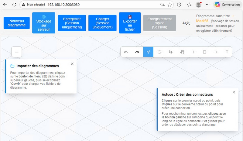 Quand vous utilisez FossFLOW, toutes les données sont stockées dans la session de votre navigateur. Autrement dit, vous ne laissez pas de trace sur le serveur distant. Dans le cas d’une instance auto-hébergée, il est possible d’enregistrer les diagrammes directement sur le serveur, mais cela reste facultatif.