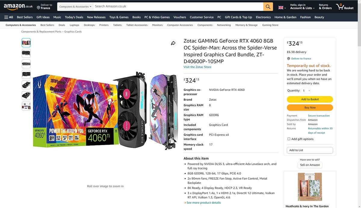 Amazon UK a en effet référencé trois cartes, dont un modèle très intéressant avec un seul ventilateur de 92 mm ; une future référence pour les configurations compactes avec deux occupations PCI ? Celle-ci s’affiche à £ 306.09, suivie d’une Twin Edge OC White Edition plus classique à £ 322.73. Pour terminer la collection, c’est une Spider-Man: Across the Spider-Verse qui est à £ 324.13.