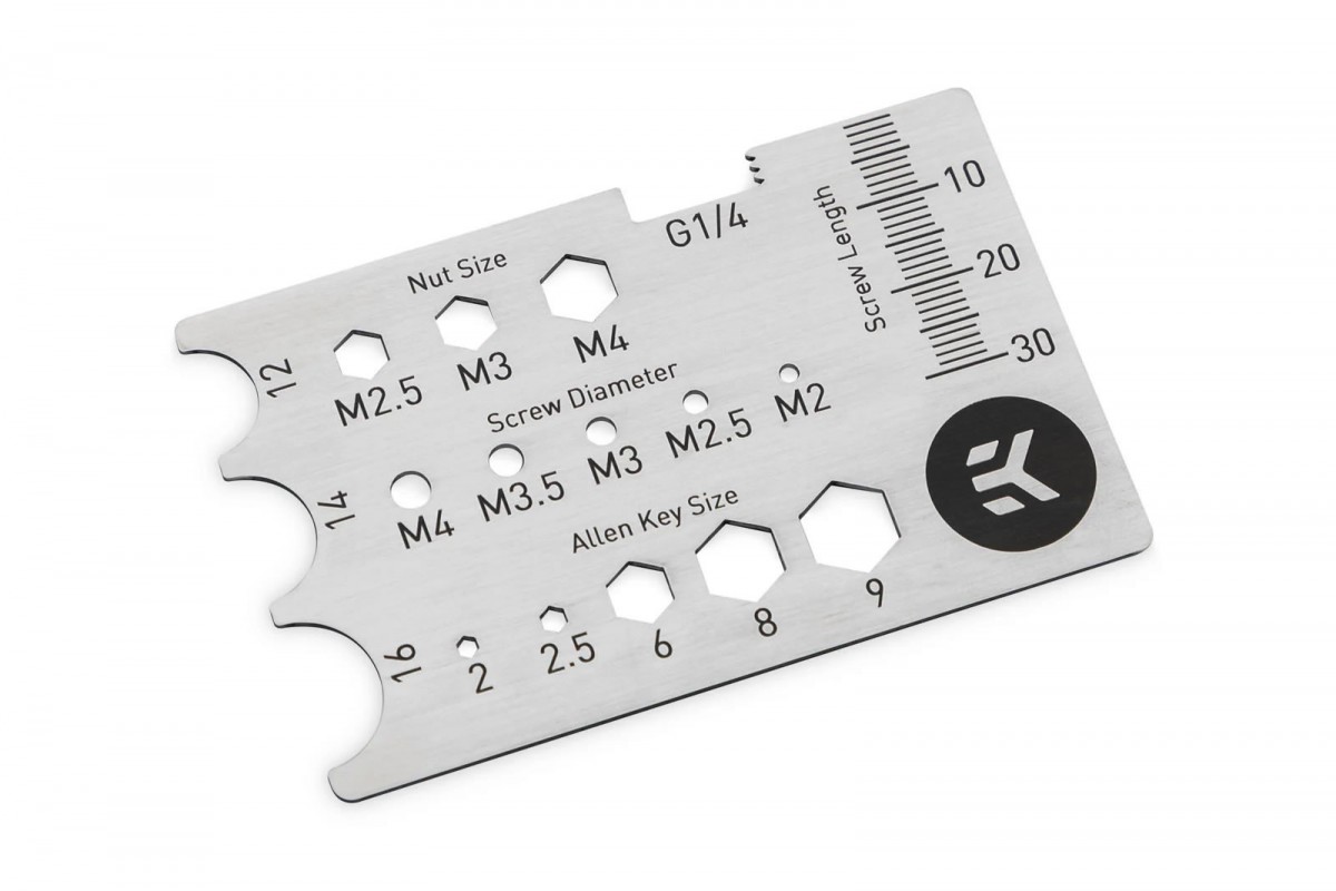 Petit accessoire inutile donc indispensable chez EKWB avec une carte en métal qui donne de précieuses informations sur la visserie, les tuyaux et embouts quand on monte une boucle watercooling. Vendue 10 U+20AC environ, elle reprend les dimensions d’une carte de crédit (ou débit, ne soyons pas sectaires) et permet de vérifier le diamètre et la longueur d’une vis, la taille d’un écrou ou encore le diamètre d’un tuyau.