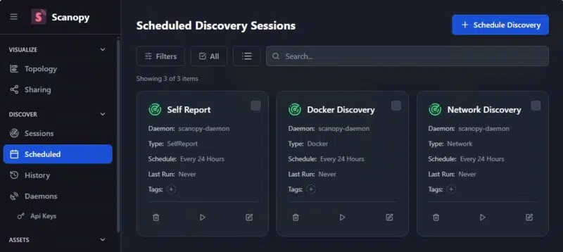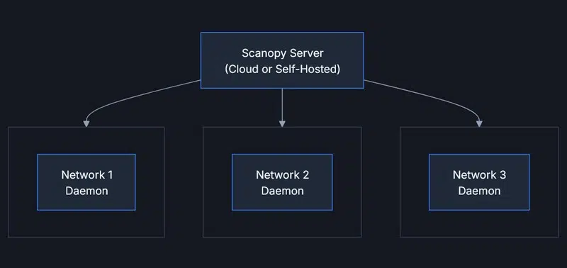Scanopy est une solution open source avec une version communautaire (gratuite pour un usage personnel ; voir cette page) capable de scanner un ou plusieurs réseaux. En effet, l’outil repose sur deux composants clés : le serveur accessible via une interface web et qui centralise les données, et le daemon qui agit comme un agent de découverte réseau. Vous pouvez déployer un agent sur différents réseaux (un par VLAN, par exemple) et centraliser toutes les informations sur un seul serveur. Le fait de positionner un agent directement sur un réseau permet de collecter plus d’informations (y compris les adresses MAC). Son architecture est détaillée sur cette page.