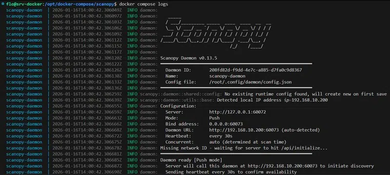 Le code ci-dessous a été utilisé pour le déploiement de ce conteneur. J’ai repris le code proposé par Scanopy lors de la création du daemon sur l’interface web, en ajustant seulement 2 informations : l’URL vers le serveur Scanopy () et le chemin vers le volume persistant ().