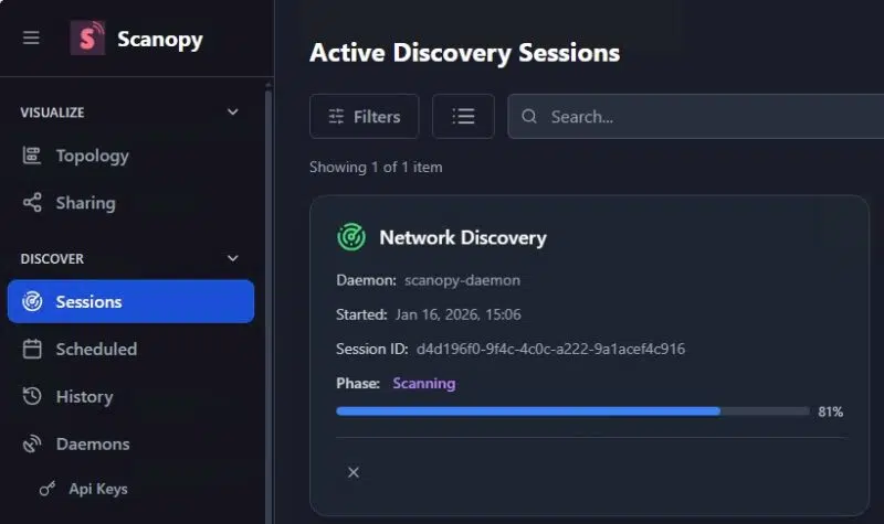 Si vous cliquez sur “Sessions” à gauche, vous verrez qu’il y a une tâche en cours : elle montre bien que le daemon Scanopy scanne actuellement le réseau.