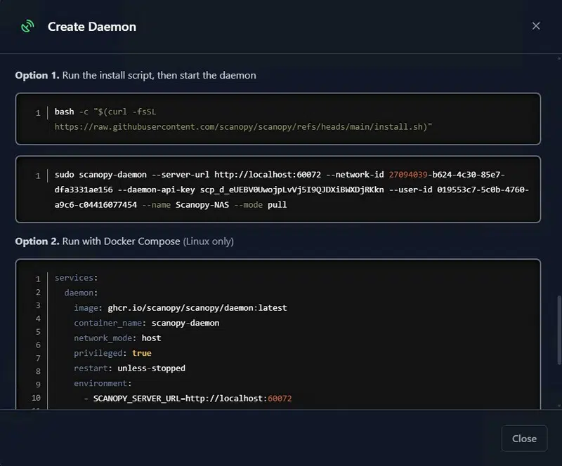 Vous avez deux options pour installer ce daemon : lancer un script Bash ou l’exécuter avec Docker Compose. Dans les deux cas, des instructions détaillées sont fournies. En fonction des informations saisies dans le formulaire, les commandes sont ajustées automatiquement.