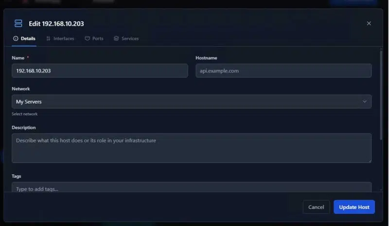 Scanopy va découvrir vos hôtes, mais ce sera sûrement partiel. Par exemple, les noms d’hôtes ne vont pas forcément remonter, tout dépend du comportement des systèmes interrogés. En fonction de leur configuration, ils ne seront pas tous aussi bavards… L’intérêt étant de laisser Scanopy travailler, puis de repasser derrière lui pour personnaliser la fiche des hôtes détectés (mettre le nom, par exemple).