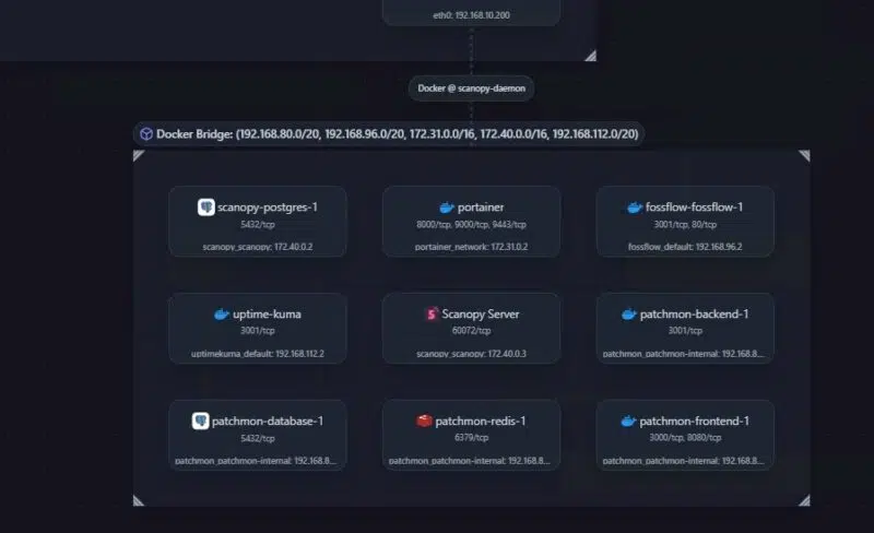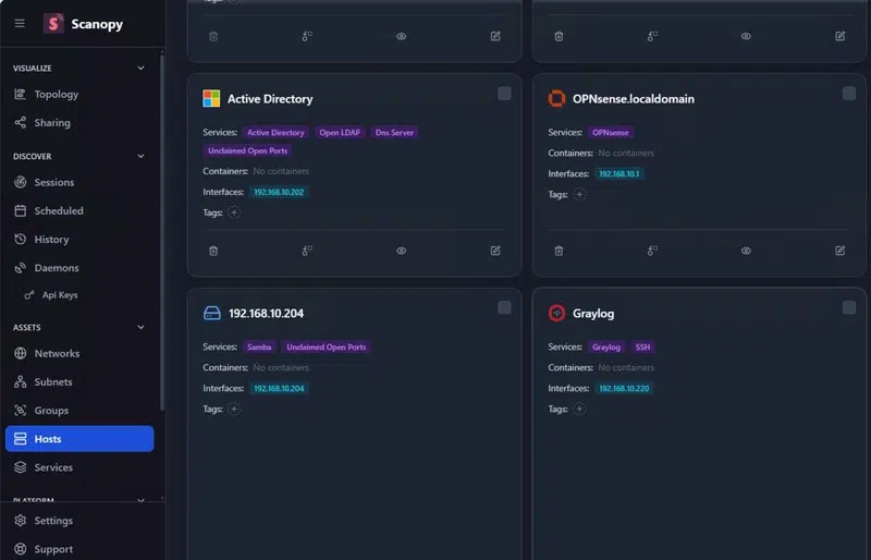 Scanopy est capable de détecter plus de 200 services différents : Docker, Veeam, Proxmox Backup Server, MariaDB, Active Directory, Bitwarden, Keycloak, Nextcloud, SSH, CrowdSec, RDP, OPNsense, Fortinet, Graylog ou encore Grafana. Il détecte donc des services spécifiques qu’il est capable de nommer et des services génériques (SSH, RDP, etc.), voire des types d’équipements (pare-feu, poste de travail, etc.). Il peut aussi analyser un hôte Docker en se connectant directement au moteur Docker en lui-même.