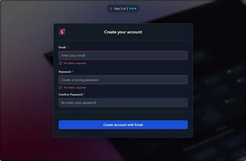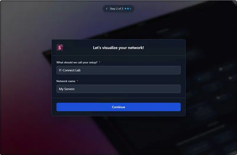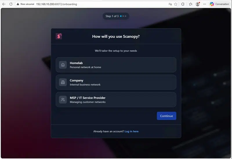 Ouvrez votre navigateur Web et accédez à l’interface d’administration de Scanopy. Un assistant avec 3 étapes doit être complété pour commencer. Vous devez commencer par préciser le contexte d’utilisation.