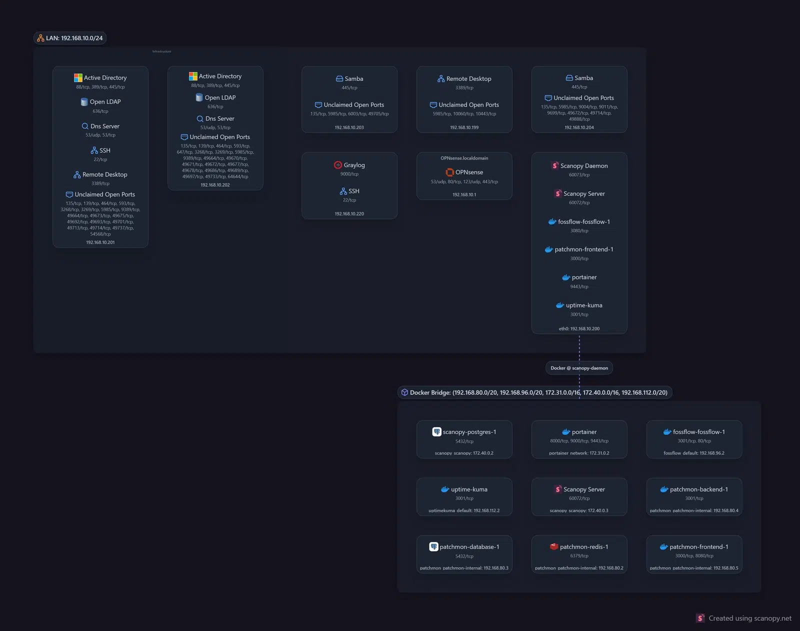 Sur l’environnement où il a été exécuté et où quelques machines sont exécutées, Scanopy a pu identifier plusieurs machines. On voit notamment deux contrôleurs de domaine Active Directory, un serveur Graylog, un pare-feu OPNsense, un serveur avec des partages (nommé Samba) et un autre accessible via le Bureau à distance.