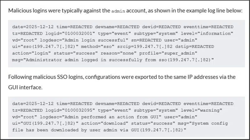 Le 16 décembre 2025, l’agence américaine CISA a actualisé son catalogue des vulnérabilités connues et exploitées (KEV) pour y ajouter la vulnérabilité CVE-2025-59718. De son côté, la société Arctic Wolf a publié un nouveau rapport pour évoquer des attaques en cours, avec notamment des tentatives de connexion malveillantes sur le compte admin des équipements.