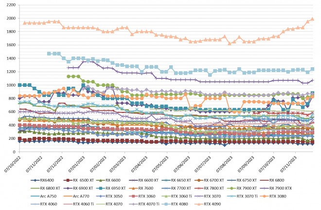Chez AMD par exemple, toutes presque les cartes sont à la hausse… 6600 + 30 euros, 6750 XT + 5 euros, 6800 + 40 euros, 6800 XT + 20 euros, 6900 XT + 147 euros, 6950 XT + 162 euros, 7600 + 30 euros, 7700 XT + 32 euros, 7800 XT + 35 euros, 7900 XT + 30 euros et 7900 XTX + 40 euros. Cela fait mal…, mais n’oublions pas de dire que la 6650 XT perd 5 euros. […]
