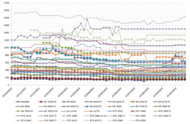 Déjà, nous n’avons pas une seule hausse chez les rouges et même des baisses de prix. La 6700 XT perd 10 euros, la 6800 baisse de 10 euros, la 6900 XT passe à son prix le plus bas de tous les temps en s’affichant à 579 euros et la 7800 XT baisse de 11 euros.