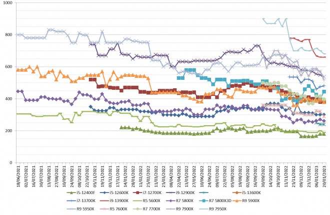 On passe aux processeurs. Cette semaine, c’est surtout AMD qui fait parler de lui. En effet, chez les bleus, nous avons seulement deux changements. Le premier sur le i9-12900K qui perd 12 euros et le second sur le i7-13700K qui prend 6 euros.