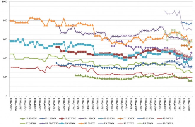 On commence directement chez les bleus avec le i9-12900K qui baisse de 5 euros. De son côté, le i5-13600K prend 6 euros, le i7-13700K augmente de 23 euros et le i9-13900K prend 12 euros.