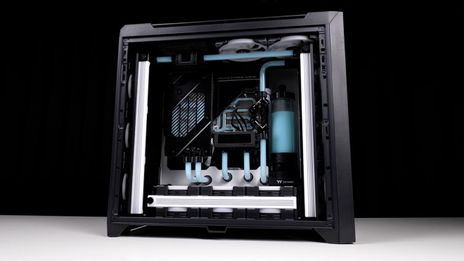 Bien qu’on en ait croisé un bon nombre au Computex, Cooling Bro ouvre le bal en exposant virtuellement sa vision d’un mod dans le nouveau boîtier Thermaltake CTE 750. Il s’agit d’un boîtier monstrueux en format E-ATX, dont Mantidor nous parle en détail dans sa dernière vidéo. Le mod prend place dans la version noire de ce boîtier, mais aussi dans la version TG, c’est-à-dire avec une façade vitrée. Les composants sont placés avec la connectique vers le haut, une chose que peu de boîtiers permettent, avec la majorité des tuyaux de watercooling tournés vers le bas traversant un support blanc. Ils acheminent un liquide bleu clair mat vers des composants noirs en passant par des radiateurs blancs. […]