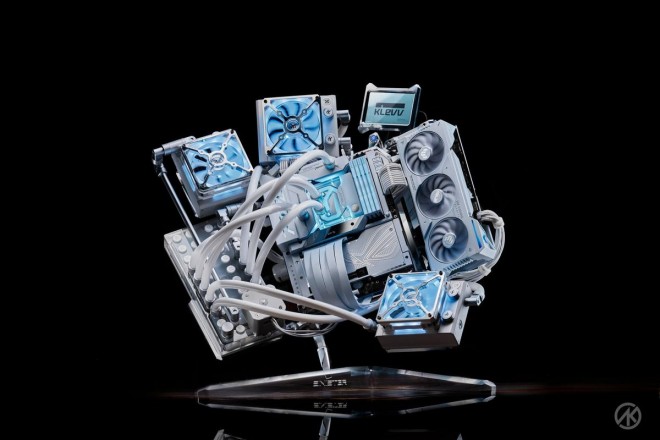 Et c’est reparti pour un mod aussi farfelu que bien réalisé avec le projet Zero Gravity par AK Mod. Un mod laissant tous les composants éclatés en suspension qui a dû demander beaucoup de travail à l’artiste. On retrouve plusieurs radiateurs de 120 mm et un réservoir pompe servant aussi de plaque de distribution par laquelle partent des tuyaux blancs entremêlés acheminant le liquide vers le processeur. Tout immaculé de blanc, ce mod prend place sur un piédestal soigné. Pour ce mod, des photos valent mieux qu’un long discours, alors on vous laisse admirer le résultat.