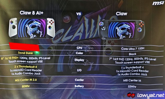 Nous le savons depuis le Computex 2024, MSI prépare une nouvelle console Claw. Ainsi, après la Claw 7 nous aurons la Claw 8 AI+. Une console qui aura le droit à des améliorations notables, la première étant un processeur en Core Ultra 200V, donc en Lunar Lake en lieu est place des modèles Ultra 5 et Ultra 7 en Meteor Lake. La mémoire sera améliorée avec de la LPDDR5X en 8533 contre LPDDR5 en 6400. Ensuite, nous aurons le droit à une dalle plus grande qui passera de 7 à 8 pouces, et de 1920 x 1080 à 1920 x 1200, toujours avec le VRR et le 120 Hz.