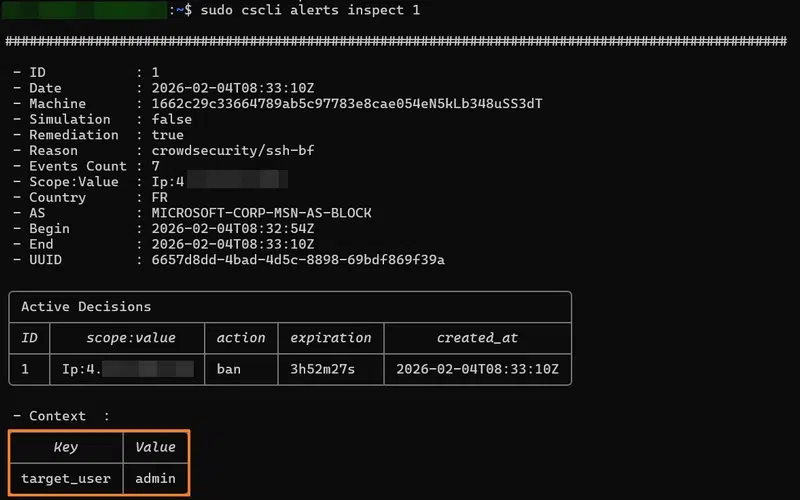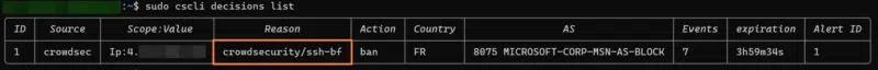 L’adresse IP de ma machine est bien visible ! La raison de cette décision est la suivante : , ce qui correspond bien au brute force SSH que nous avons tenté. Nous pouvons constater que cette adresse IP a été bannie pendant 4 heures (valeur par défaut dans CrowdSec).