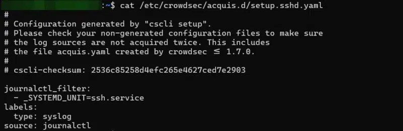 Si je regarde le contenu du fichier correspondant à SSH, je peux voir qu’il sert à déclarer la façon dont CrowdSec doit accéder aux logs SSH. Ici, il va s’appuyer sur comme source, tandis que parfois la source sera , si les journaux sont des fichiers plats (comme ceux d’Apache2, par exemple).