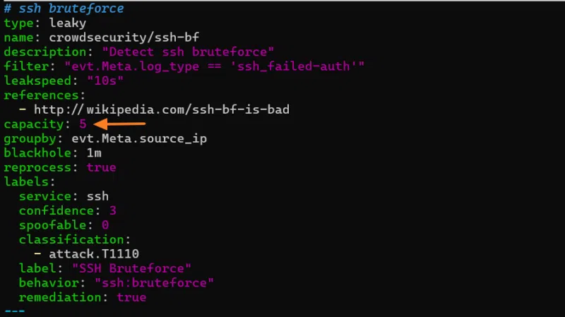 D’ailleurs, je vous invite à ouvrir le fichier correspondant au scénario . Si l’adresse IP a été bannie au bout de 6 tentatives en échec, ce n’est pas un hasard : c’est la configuration de CrowdSec qui implique cela, avec le système de bucket (type ).