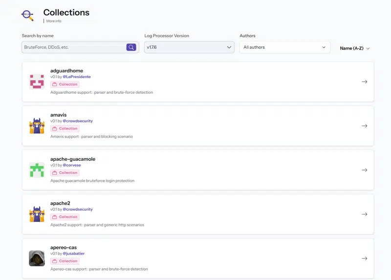CrowdSec met à disposition de la communauté des collections correspondant à différents services et scénarios d’applications. Certaines sont maintenues par CrowdSec, d’autres par des membres de la communauté. Une collection regroupe plusieurs éléments : la façon de parser les logs et les scénarios d’attaques que le moteur de sécurité peut détecter.