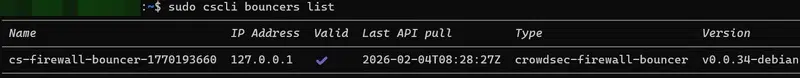 Désormais, il y a bien un bouncer CrowdSec installé et actif, connecté au moteur de détection par API. Les deux composants sont sur la même machine, d’où la présence de l’adresse IP .