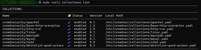 Dès à présent, vous pouvez lister les collections CrowdSec présentes sur votre machine. Ce sera l’occasion d’exécuter votre première commande avec la CLI de CrowdSec et de confirmer que le service est opérationnel.