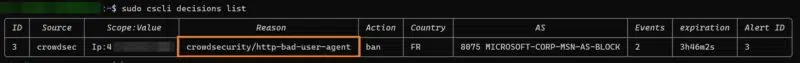 Un tour dans la liste des décisions vous le montrera ! Ici, la raison est claire : CrowdSec n’a pas apprécié notre user-agent.