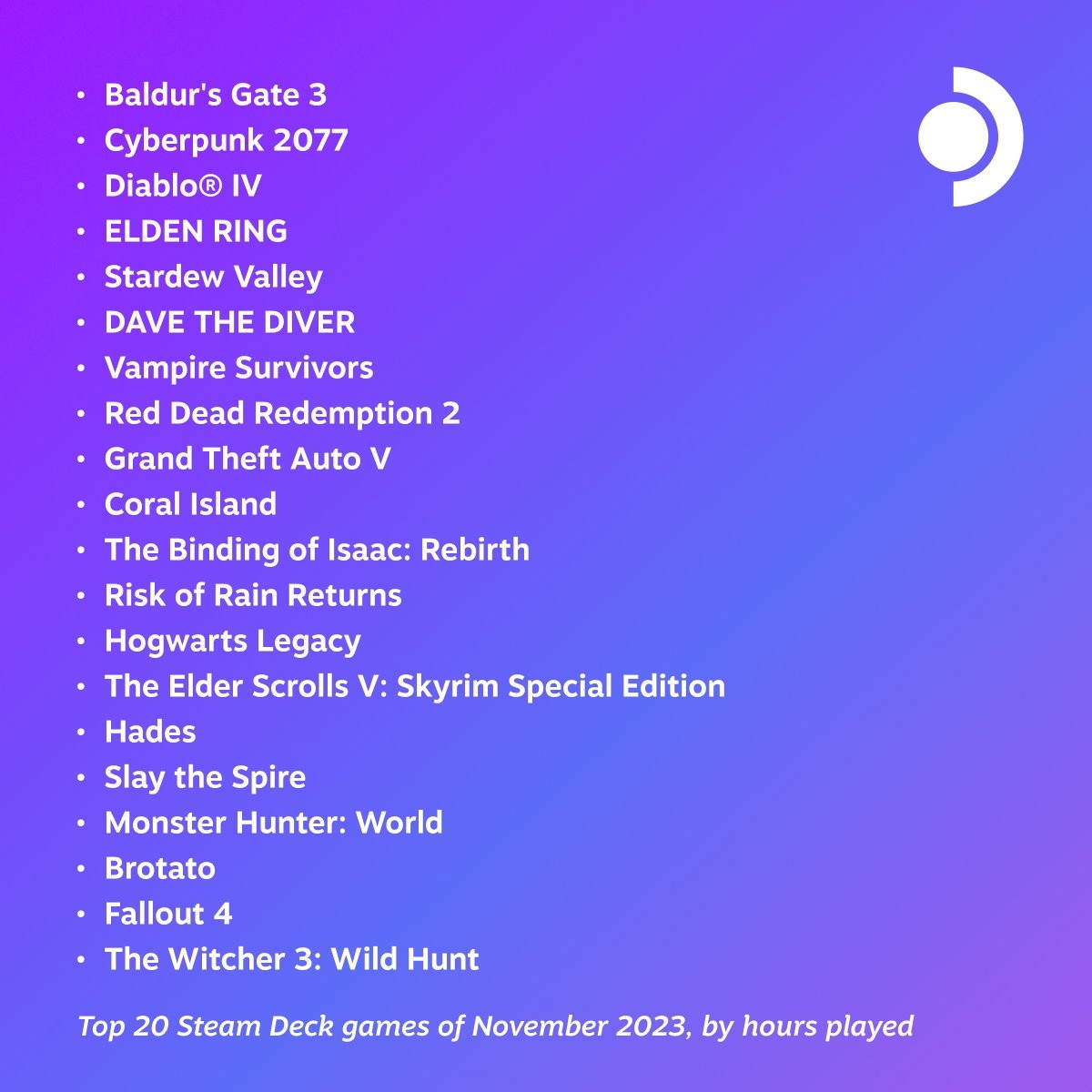 Que voilà un nouveau classement fort intéressant ! Avec des sorties et mises à jour nombreuses, le mois de novembre a chamboulé les habitudes des joueurs Steam Deck, qui commencent à délaisser certains jeux qu’on pourrait juger historiques. The Witcher 3 par exemple, qui désormais proche de la sortie du classement, ou encore Brotato. Vampire Survivors continue sa petite résistance, mais pour combien de temps ?