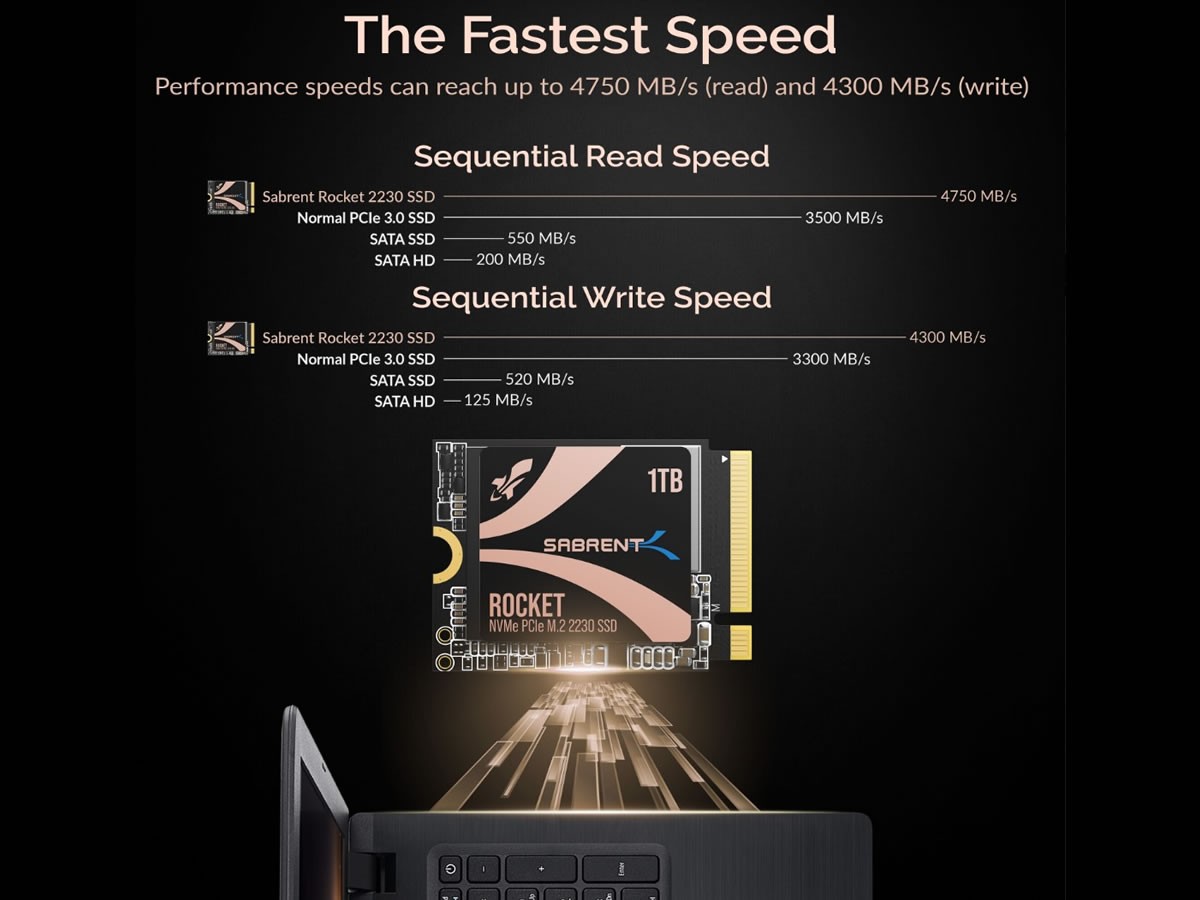 Nouveau SSD en vue chez Sabrent avec le Rocket 2230, un SSD au format M.2 2230, soit une longueur de 30 mm. Mais pas de quoi proposer des performances au rabais puisque ce nouveau venu profite d’une connexion en PCI-E Gen4 et les débits annoncés sont plutôt alléchants : 4750 Mo/s en lecture séquentielle et 4300 M/os en écriture séquentielle, le tout avec une capacité de 1 To.