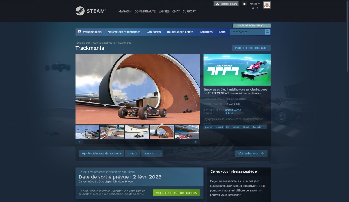 Nouveau jeu à venir sur Steam le 2 février prochain… Trackmania ! La raison du pourquoi ? Aucune idée, mais il faudra bien entendu un compte Ubisoft pour en profiter. Que dire de plus ? Car si le jeu affiche un petit 2 février 2023 en date de sortie, le jeu date déjà de 2020, en sachant qu’il s’agit d’une adaptation du jeu de 2006.