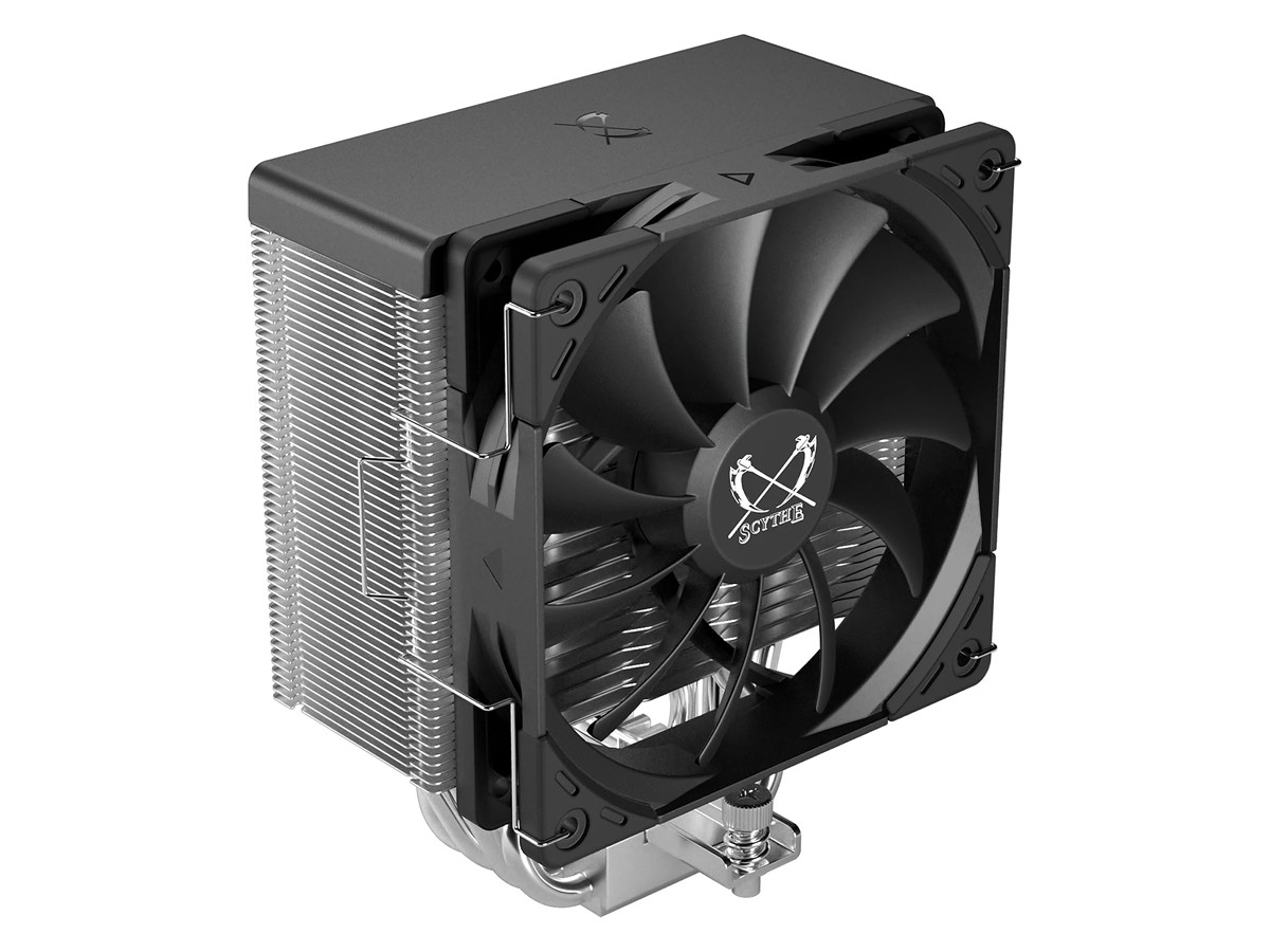 On retrouve une construction autour de quatre caloducs de 6 mm nickelés, tandis que le haut du radiateur est recouvert par une pièce en plastique avec un effet soyeux. Devant, le ventilateur retenu est tout simplement un KazeFlex II 12 qui monte à 1500 rpm pour un débit d’air de 67.62 CFM avec une pression statique de 1.50 mmAq.